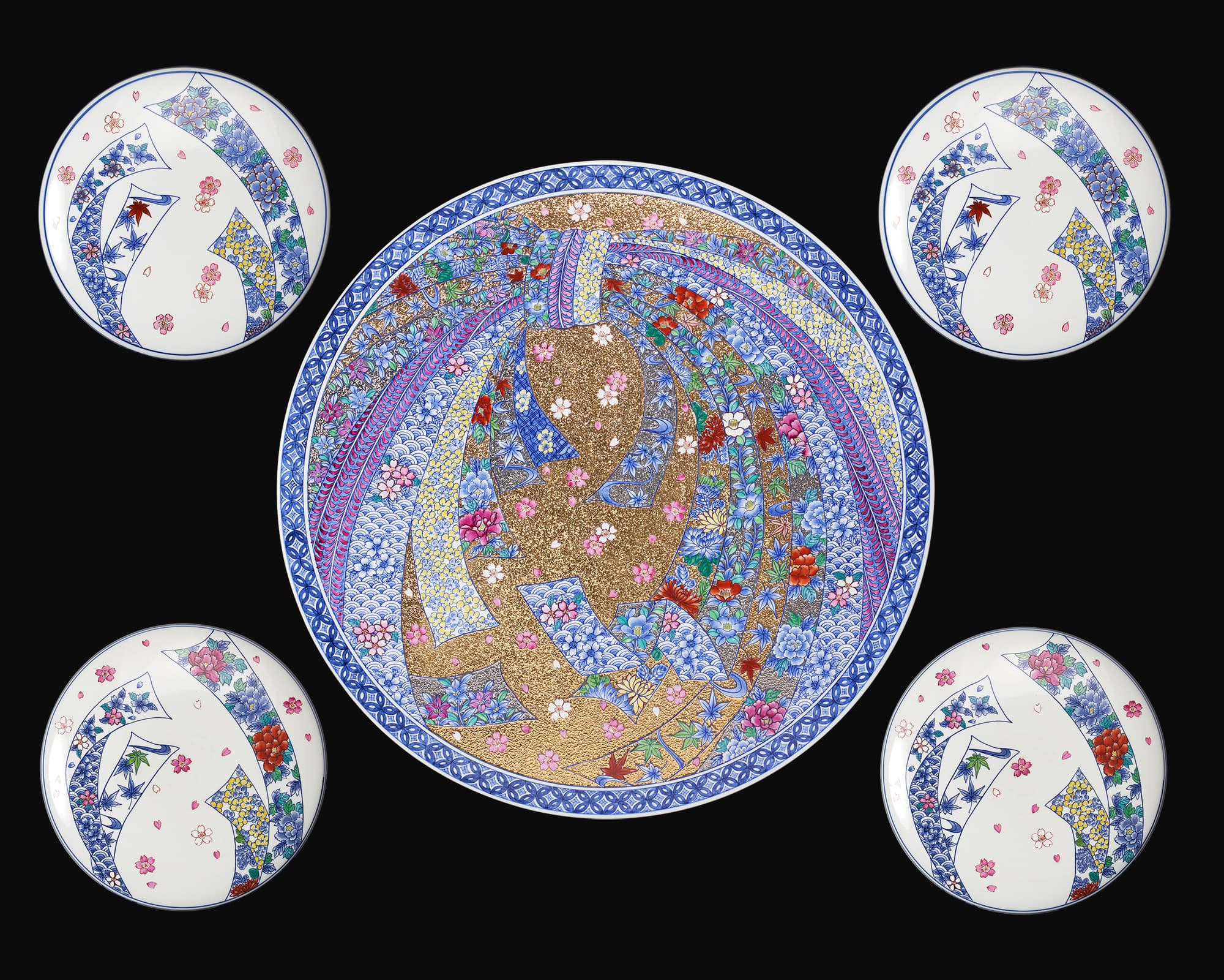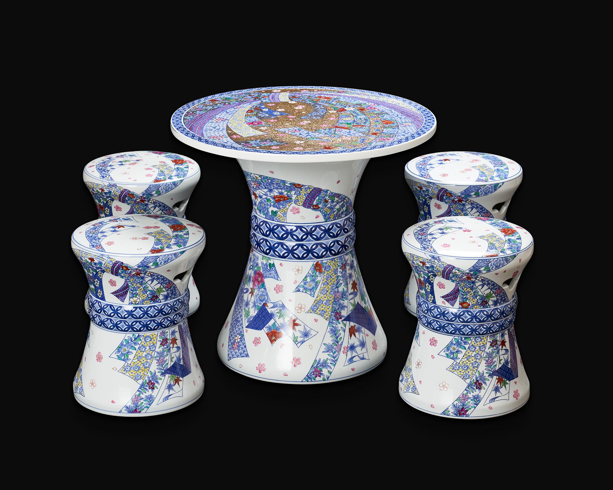 有田焼の艶やかで透き通るような下地に色鮮やかな絵付けを施した主役級のガーデンテーブルセットです。