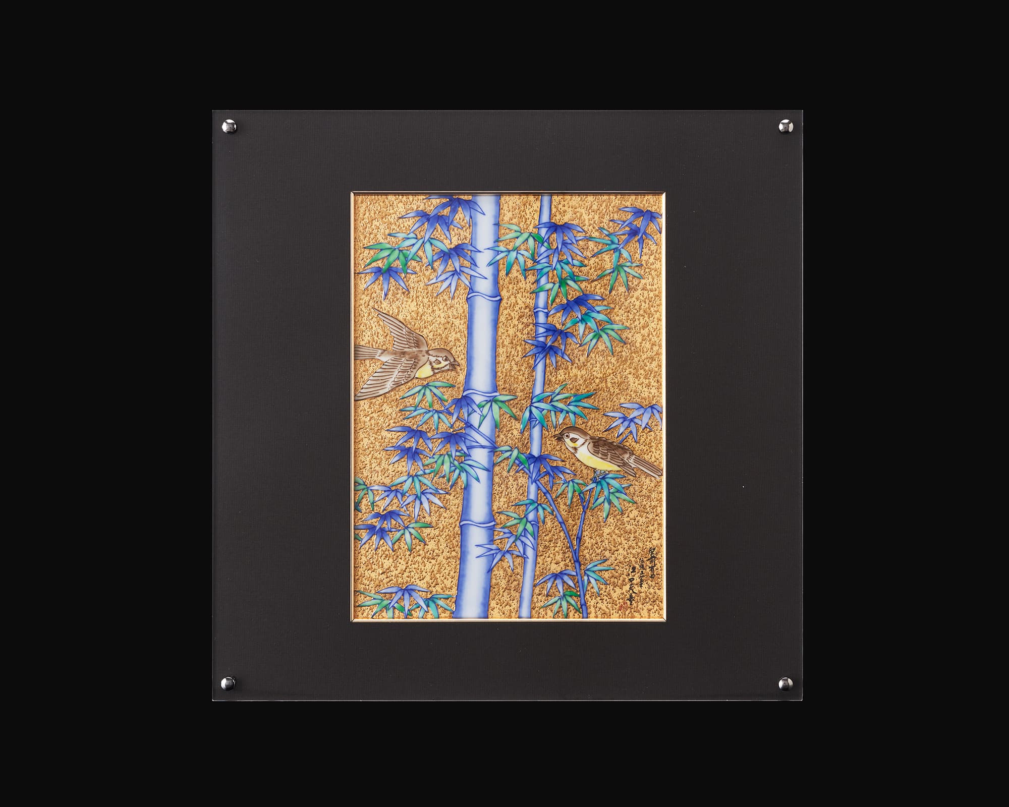 成長がとても早く真っ直ぐ伸びて地面にしっかりと根を張ることから竹は「子宝・子孫繁栄」の象徴とされています。また、鳥は「運を“とり”込むように」という意味を込めて描いております。