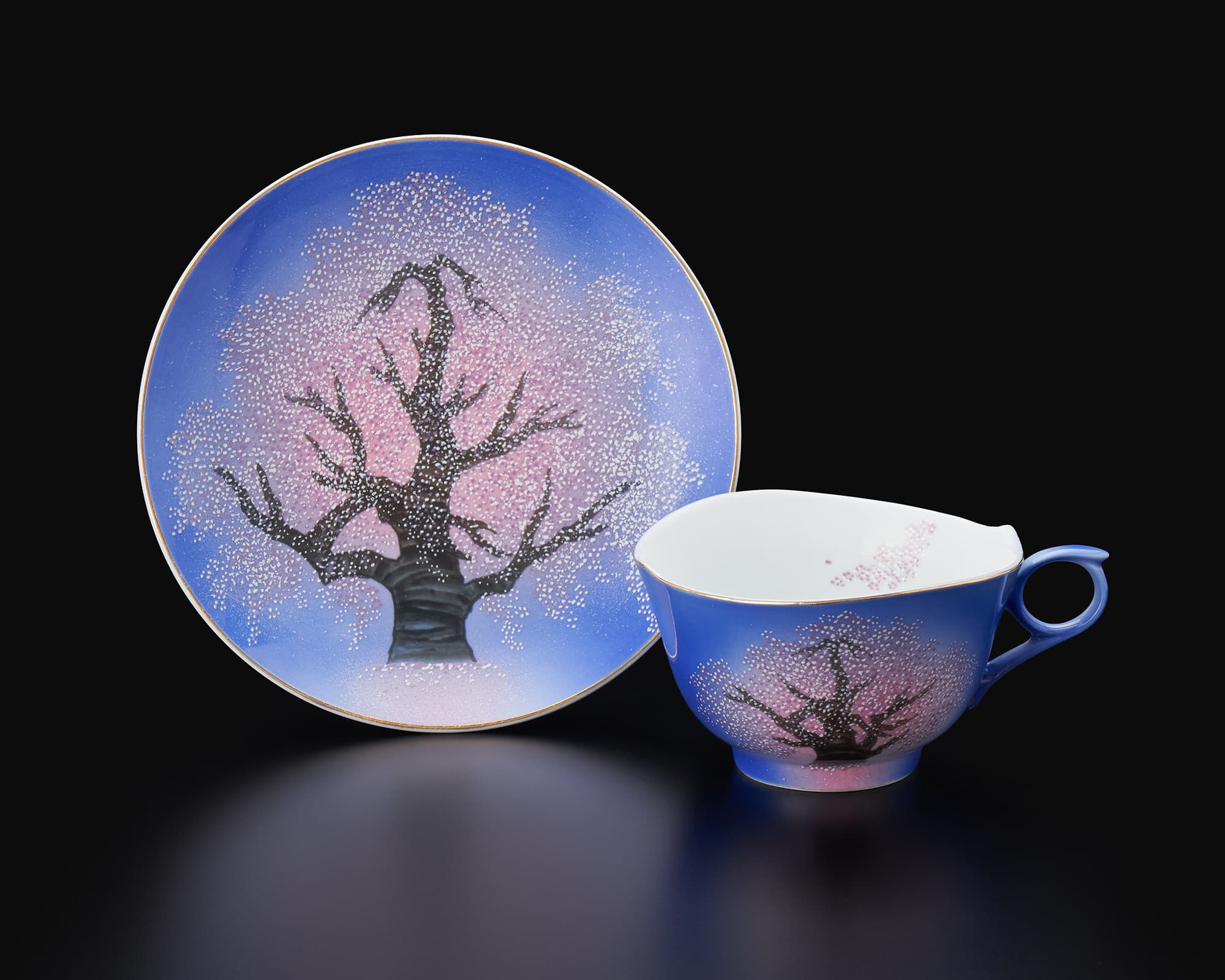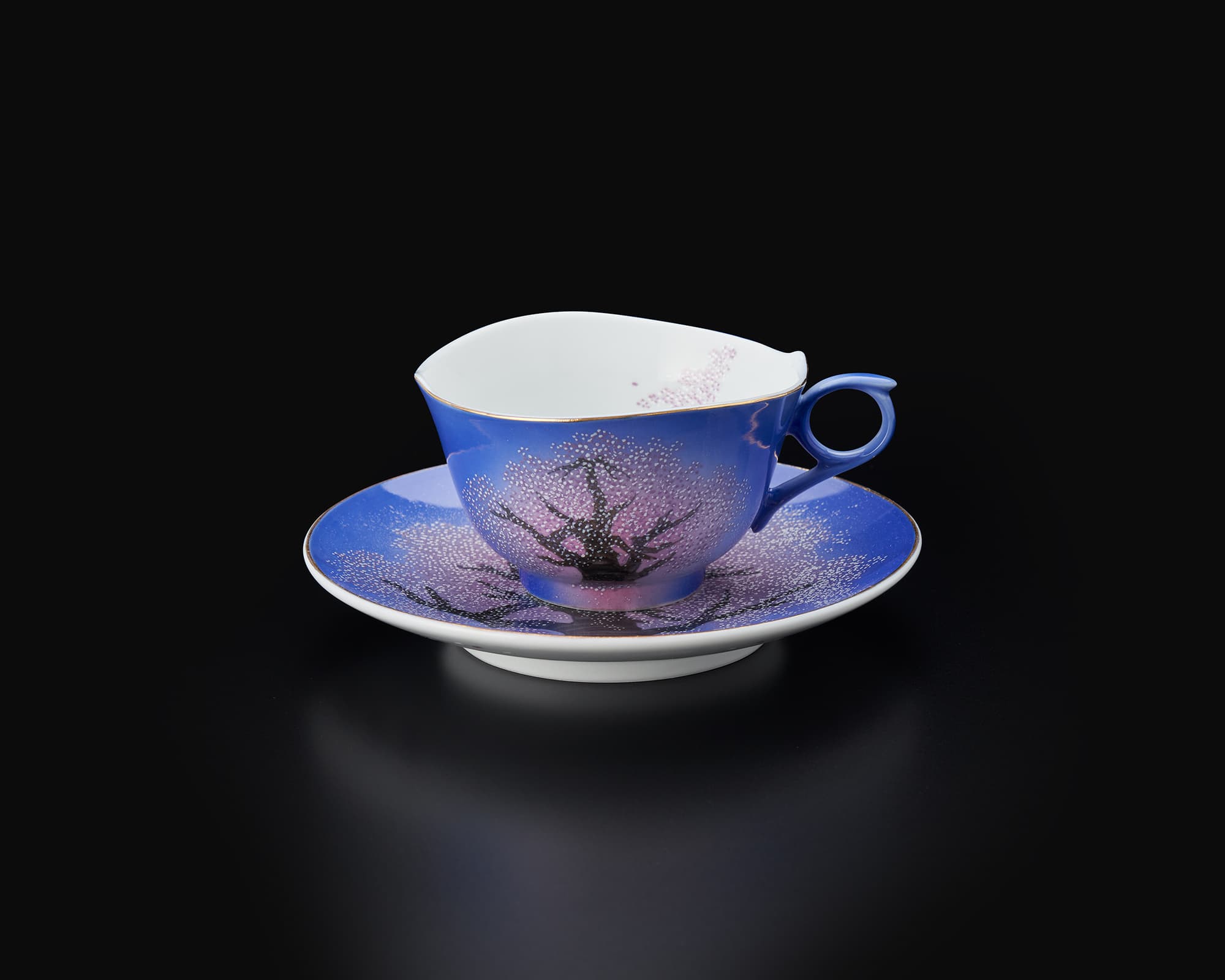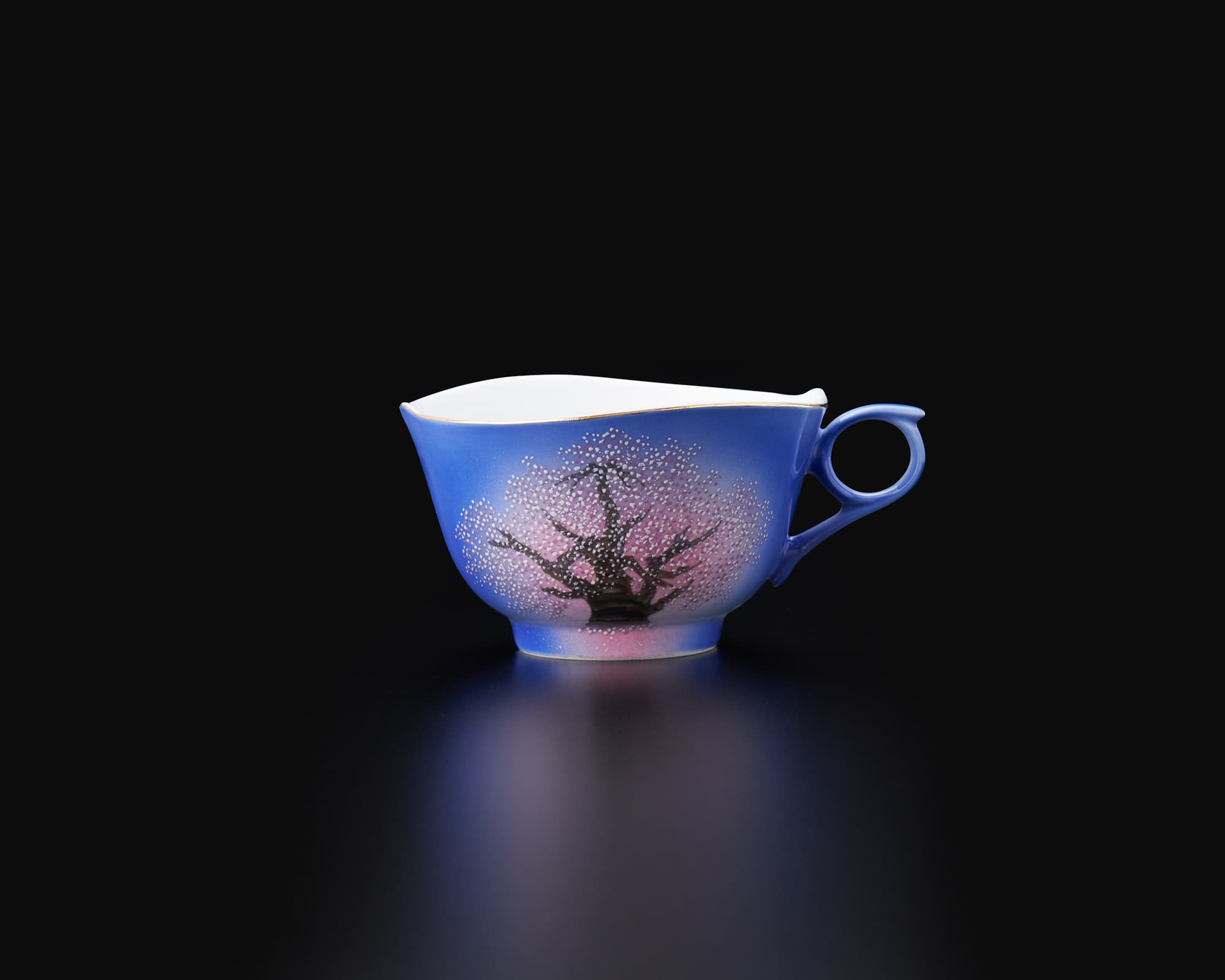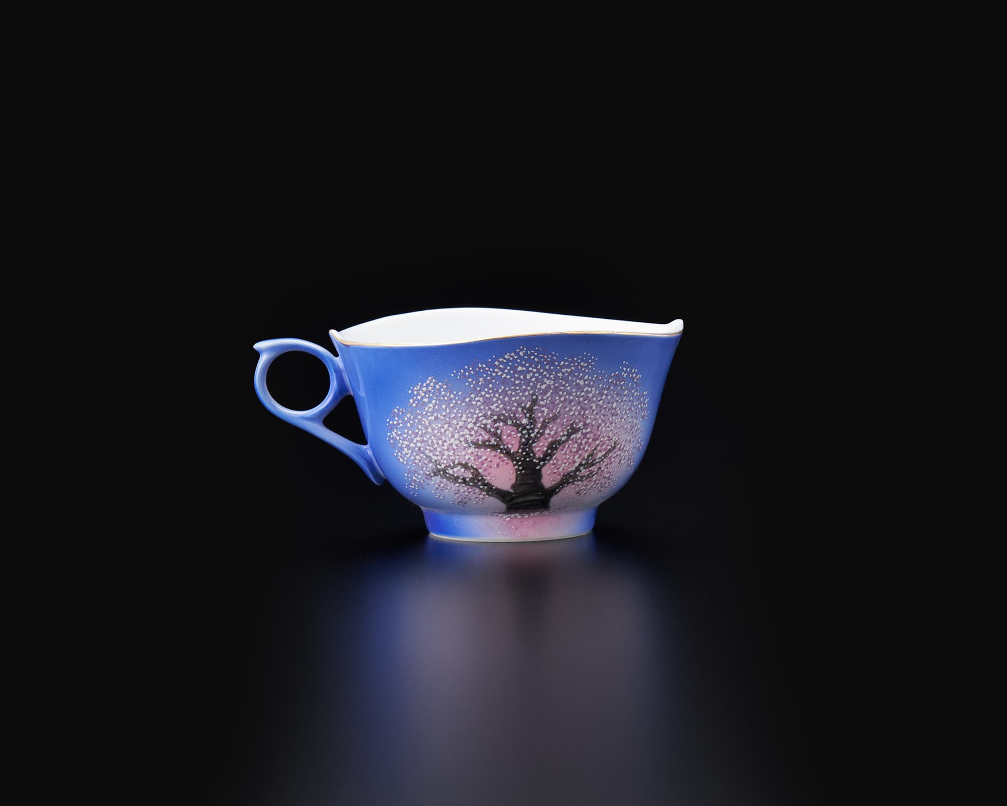 春の夜に浮かび上がる満開の桜。日本伝統の幻想的な光景を繊細なタッチで表現しました。カップの縁はゆるやかなカーブを描き、口当たりがよく飲みやすい形の珈琲碗です。